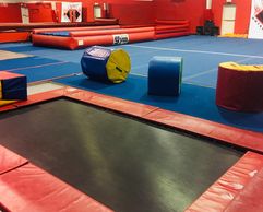 Our 10 by 15 foot trampoline is placed in-ground to maximize student safety and allow tumbling students to work real-time tumbling skills into our custom bungee pit.